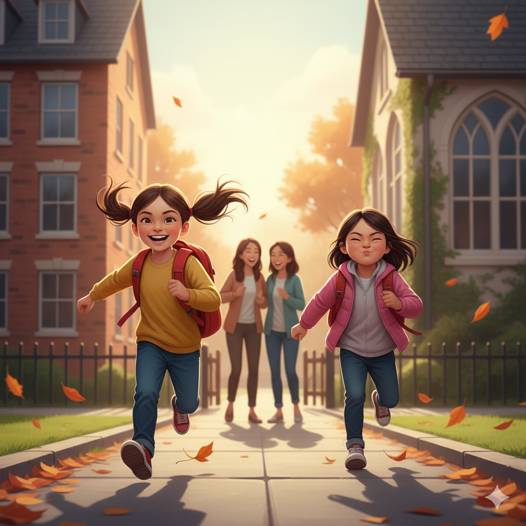 This particular morning, the sun was peeking over the rooftops, painting the sky in soft hues of pink and orange. Lily, with her bright red backpack bouncing on her shoulders, was practically vibrating with energy. Maya, a year older and a head taller, exuded an air of confident playfulness.